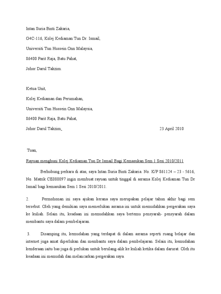 Surat Rayuan Tinggal Di Kolej Kediaman Instantasshat Addfame